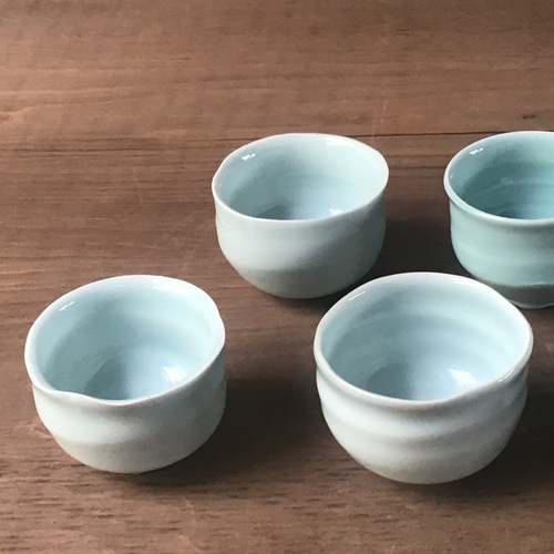 - 美術品・アンティーク・コレクション > 工芸品 > 極上品・共箱・五客揃い 白磁 取盃揃/青白磁 喜銘/通透釉肌の極・工芸美術級 青白磁ぐい吞み(直径7㎝) おちょこ・ぐい呑み・徳利 十五代油屋清
